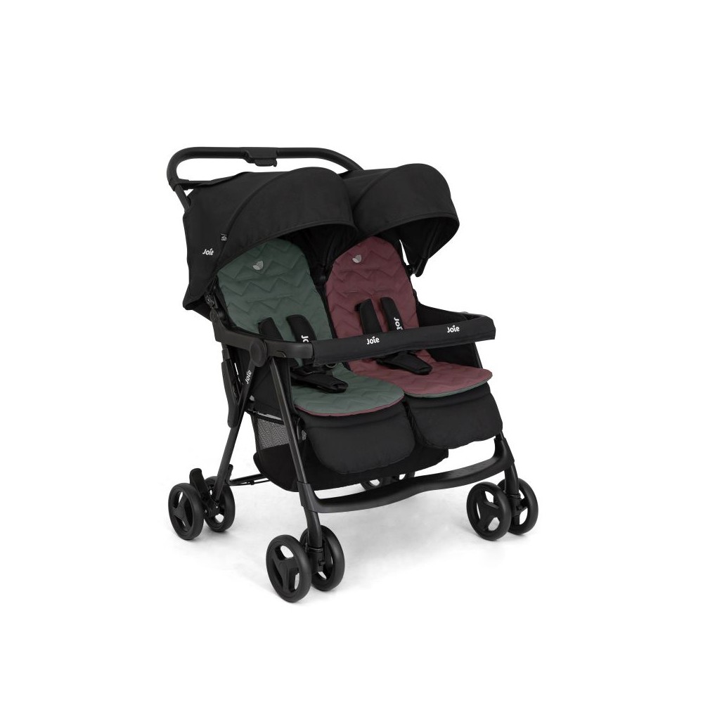 Wózek Aire Twin brytyjskiej marki Joie to lekka spacerówka przeznaczona dla dwójki dzieci już od urodzenia aż do 15 kg wagi (na jedno siedzisko). Niezależne siedziska z dwustronnymi wkładkami, płynnie regulowane położenie oparć, cztery podwójne koła, budki UPF 50+ z okienkiem oraz szybkie składanie jedną ręką czynią ten wózek niezwykle wygodnym i funkcjonalnym w użyciu.
