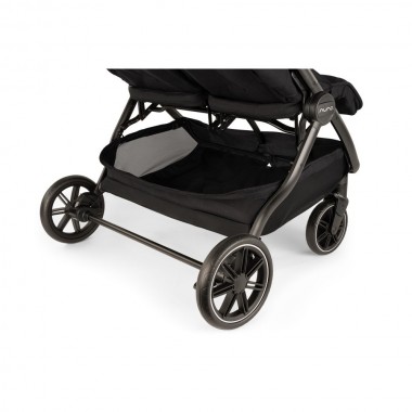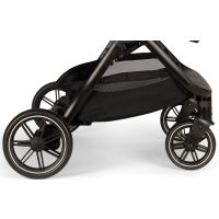 Łatwy dostęp do bardzo dużego kosza do przechowywania, który mieści do 10 kg. Szybki, aktywowany jednym dotknięciem, system hamowania tylnych kół. Przednie obrotowe koła z blokadami skrętności zapewniają wygodniejsze spacery po nierównym terenie. Amortyzacja wszystkich kół, które wykonane są z pianki EVA i przygotowane na każdy teren. W zestawie folia przeciwdeszczowa oraz torba transportowa.