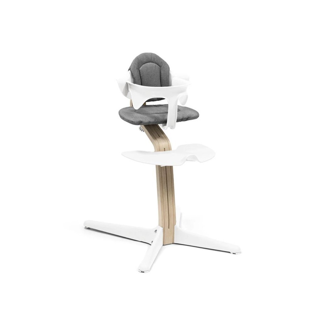 PROMOCYJNY ZESTAW, który składa się z: krzesełka w kolorze White-Natural, zestawu pomniejszającego w kolorze White, poduszki w kolorze Grey-Pink oraz tacki w kolorze White.